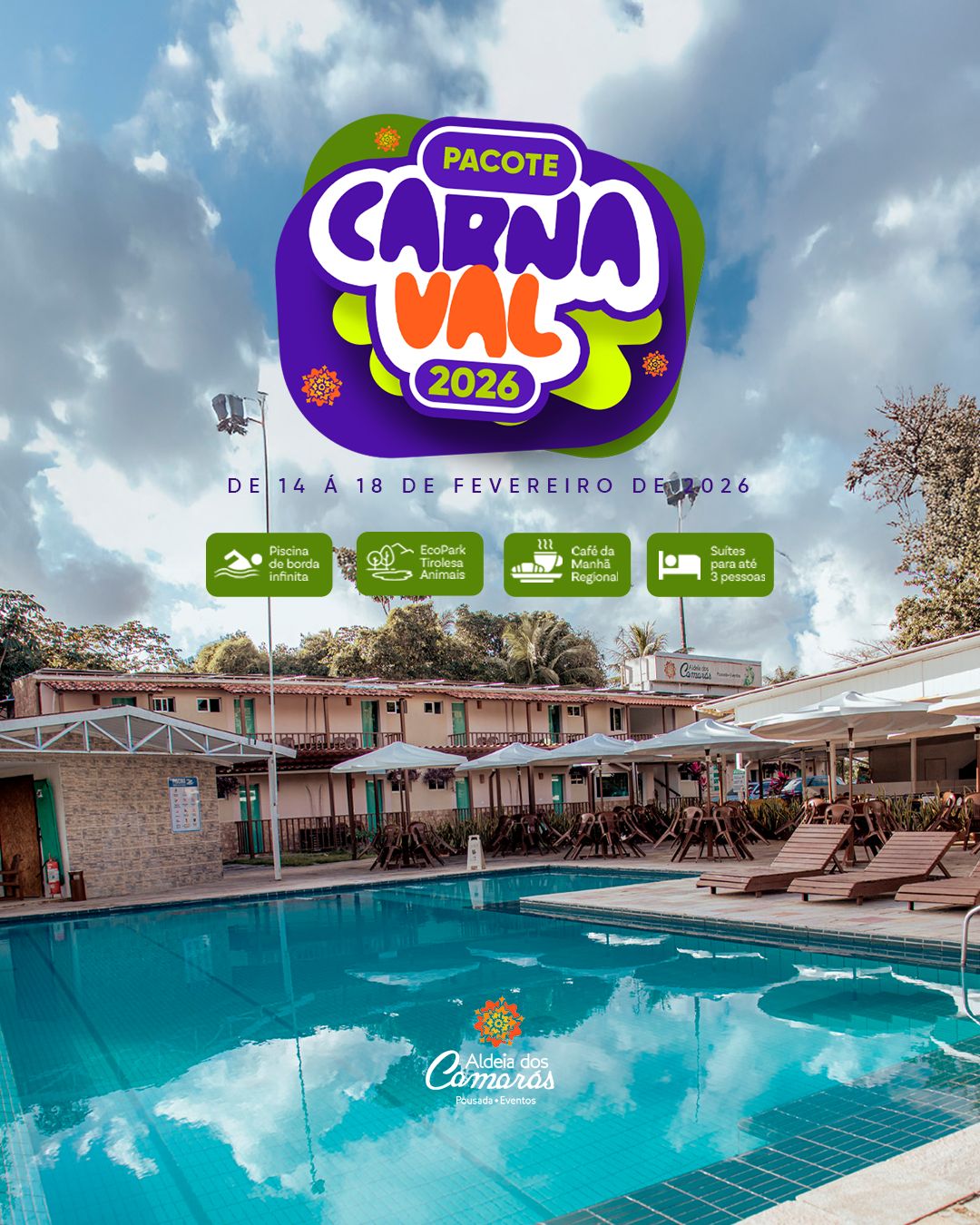 Piscina, campo de areia, brinquedoteca, parquinho, ecoparque, trilhas, e muito mais para garantir a diversão!
